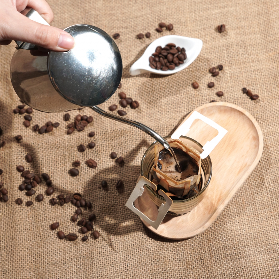 2. Shake gently to spread the coffee evenly, hook the wings of bag on the rim of cup.
