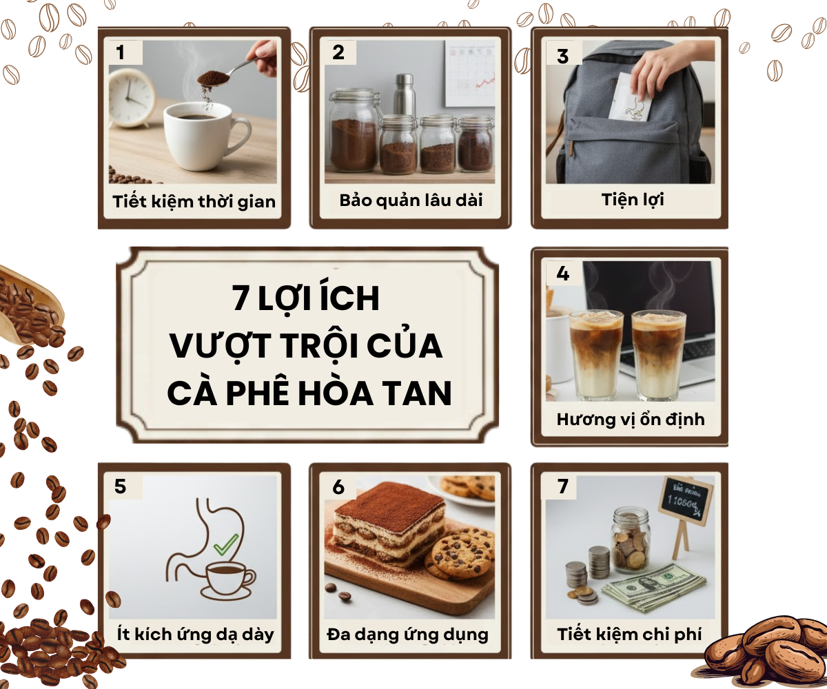 With 7 outstanding benefits, instant coffee not only meets the convenience needs of a busy life but also brings a complete and flexible coffee experience to everyone. Whether you are someone who needs to be alert every morning, often on the go or simply want a quick but still delicious option, instant coffee can completely accompany you. All that remains is to choose a quality product so that each cup of coffee becomes a small, exciting moment of the day.