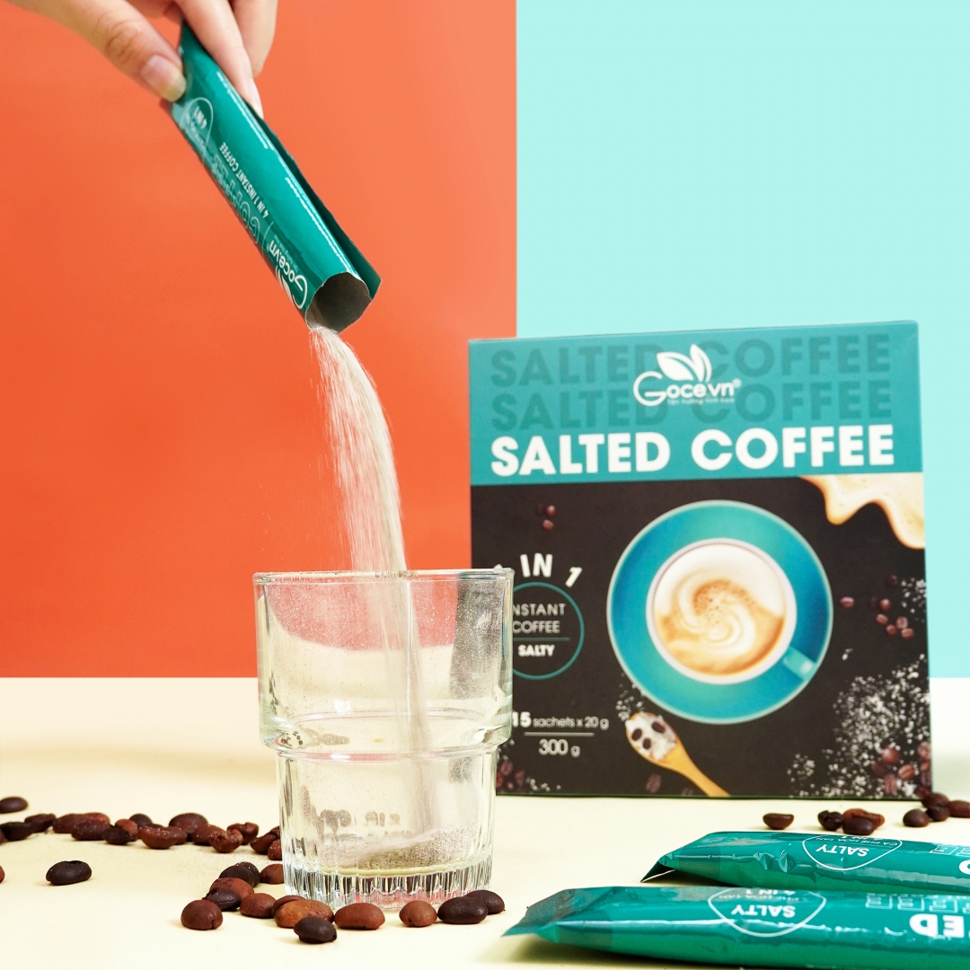 Salted Coffee - Cà phê muối dòng cà phê hòa tan 4 in 1 mang đậm vị thơm béo sóng sánh hòa quyện cùng chút mặn cân bằng, đúng ý chuẩn vị. Một sự trải nghiệm mới mẻ cho những ai muốn khám phá thế giới muôn màu của cà phê.