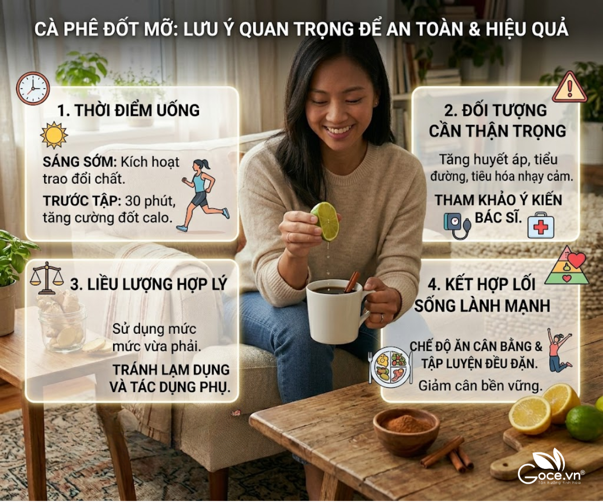 Thời điểm uống: Nên uống cà phê kết hợp các nguyên liệu này vào buổi sáng để kích hoạt quá trình trao đổi chất hoặc khoảng 30 phút trước khi tập luyện để tăng cường đốt cháy calo.