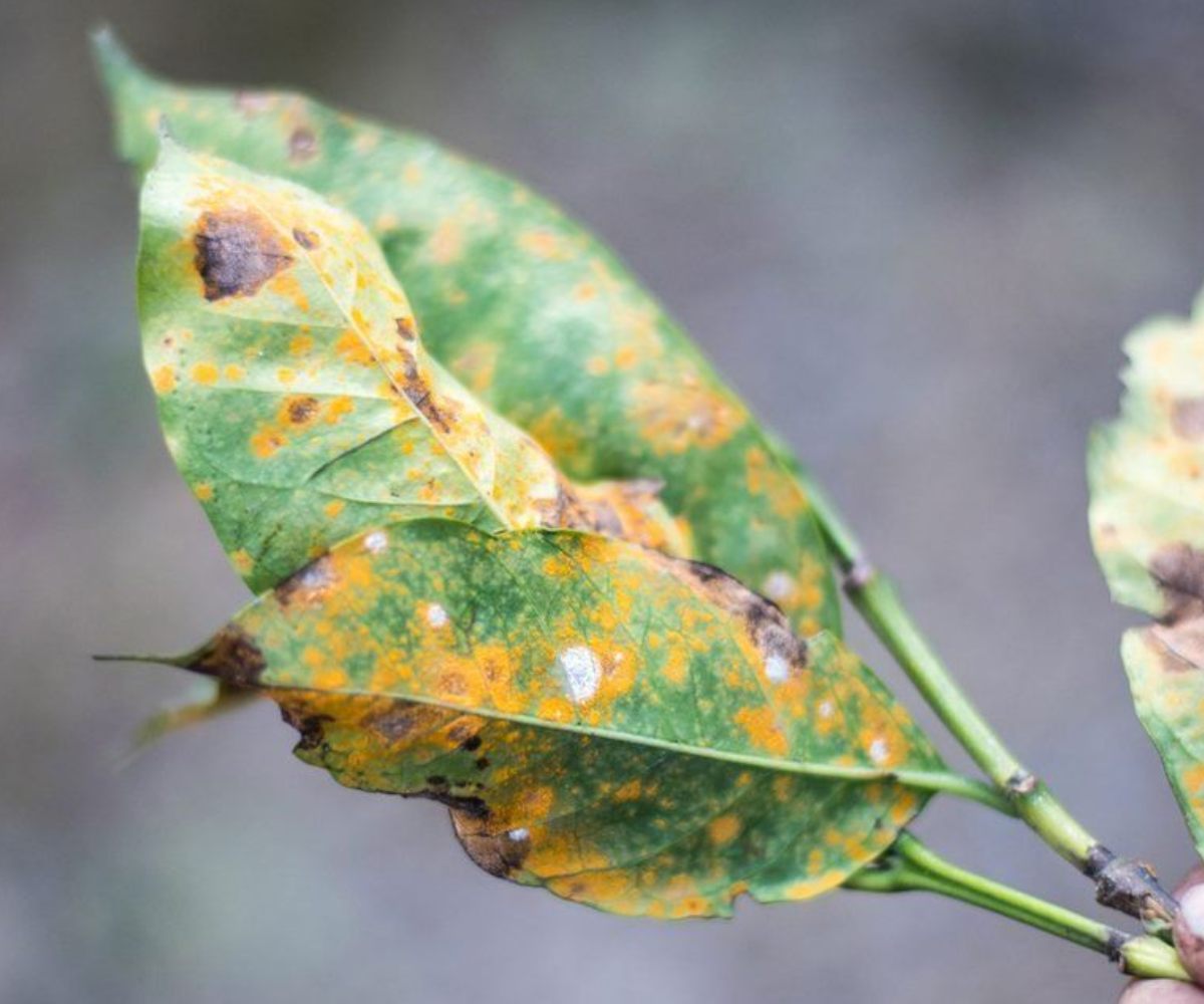Bệnh gỉ sắt do nấm Hemileia vastatrix gây ra, thường bùng phát mạnh vào mùa mưa, khi độ ẩm cao và nhiệt độ dao động từ 21–25°C. Dấu hiệu dễ nhận biết nhất là các đốm vàng cam xuất hiện ở mặt dưới lá, kèm lớp bột màu cam nhạt. Khi bệnh nặng, lá rụng hàng loạt khiến cây suy yếu, giảm khả năng nuôi quả.