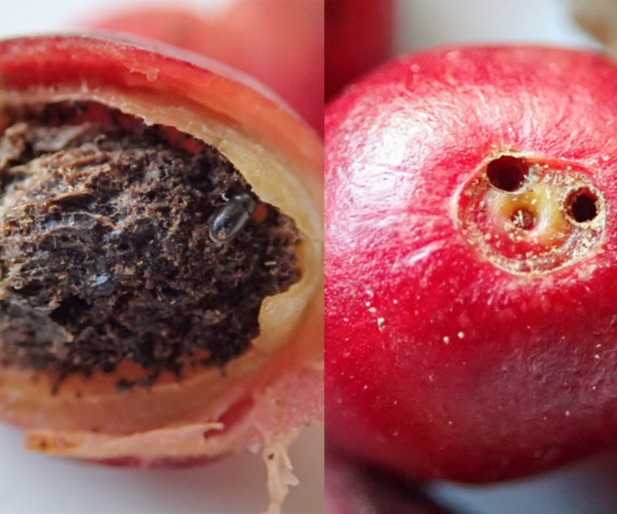 Sâu đục quả cà phê (Hypothenemus hampei) là đối tượng gây hại trực tiếp đến hạt – phần giá trị nhất của cây cà phê. Chúng đục vào quả khi quả bắt đầu chín, để lại lỗ nhỏ ở đỉnh quả. Bên trong, ấu trùng ăn hạt làm hạt bị đen, xốp và giảm mạnh phẩm cấp.