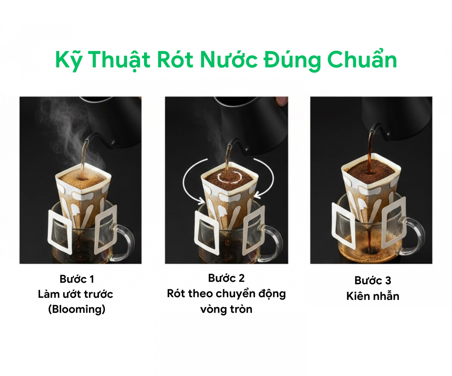 Sau khi blooming, rót từ từ phần nước còn lại theo chuyển động vòng tròn từ ngoài vào trong, đảm bảo nước tiếp xúc đều với toàn bộ bột cà phê. Tránh rót thẳng vào một điểm vì sẽ tạo "lỗ thủng" và nước chảy qua mà không chiết xuất đủ hương vị.