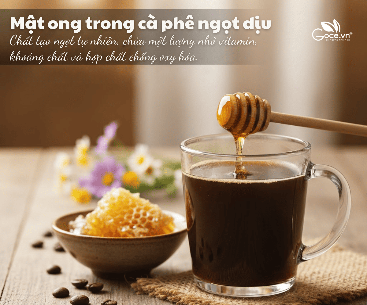 Mật ong là chất tạo ngọt tự nhiên, chứa một lượng nhỏ vitamin, khoáng chất và hợp chất chống oxy hóa. Khi dùng trong cà phê, vị ngọt thường nhẹ và có chiều sâu hơn.