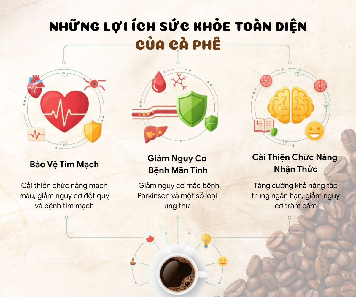 Bảo vệ tim mạch: Cà phê giúp cải thiện chức năng mạch máu, giảm nguy cơ đột quỵ và bệnh tim mạch. Trái với quan niệm cũ cho rằng cà phê làm tăng huyết áp, các nghiên cứu hiện đại cho thấy khi uống đều đặn, cà phê thực sự có tác dụng bảo vệ hệ tuần hoàn.