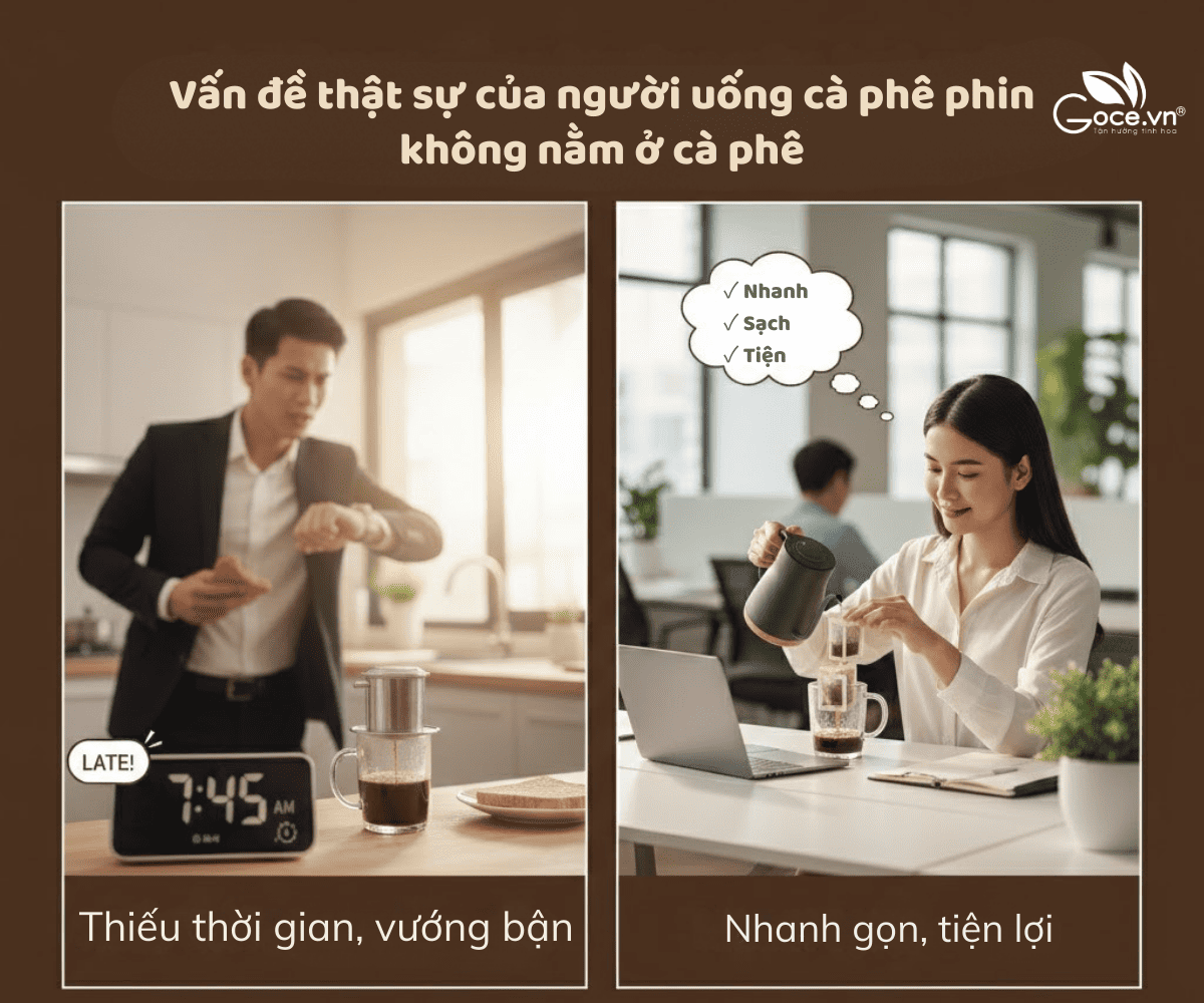 - Buổi sáng gấp gáp, không đủ 10 đến 15 phút chờ phin nhỏ giọt.