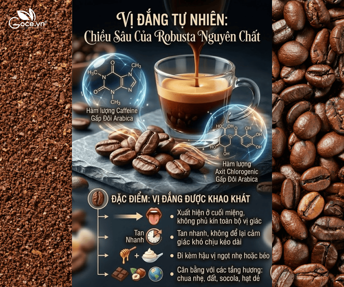 Đây là vị đắng bạn muốn có. Nó đến từ bản chất hóa học của hạt cà phê nguyên chất, đặc biệt là giống Robusta, vốn có hàm lượng caffeine và axit chlorogenic cao gấp đôi Arabica.
