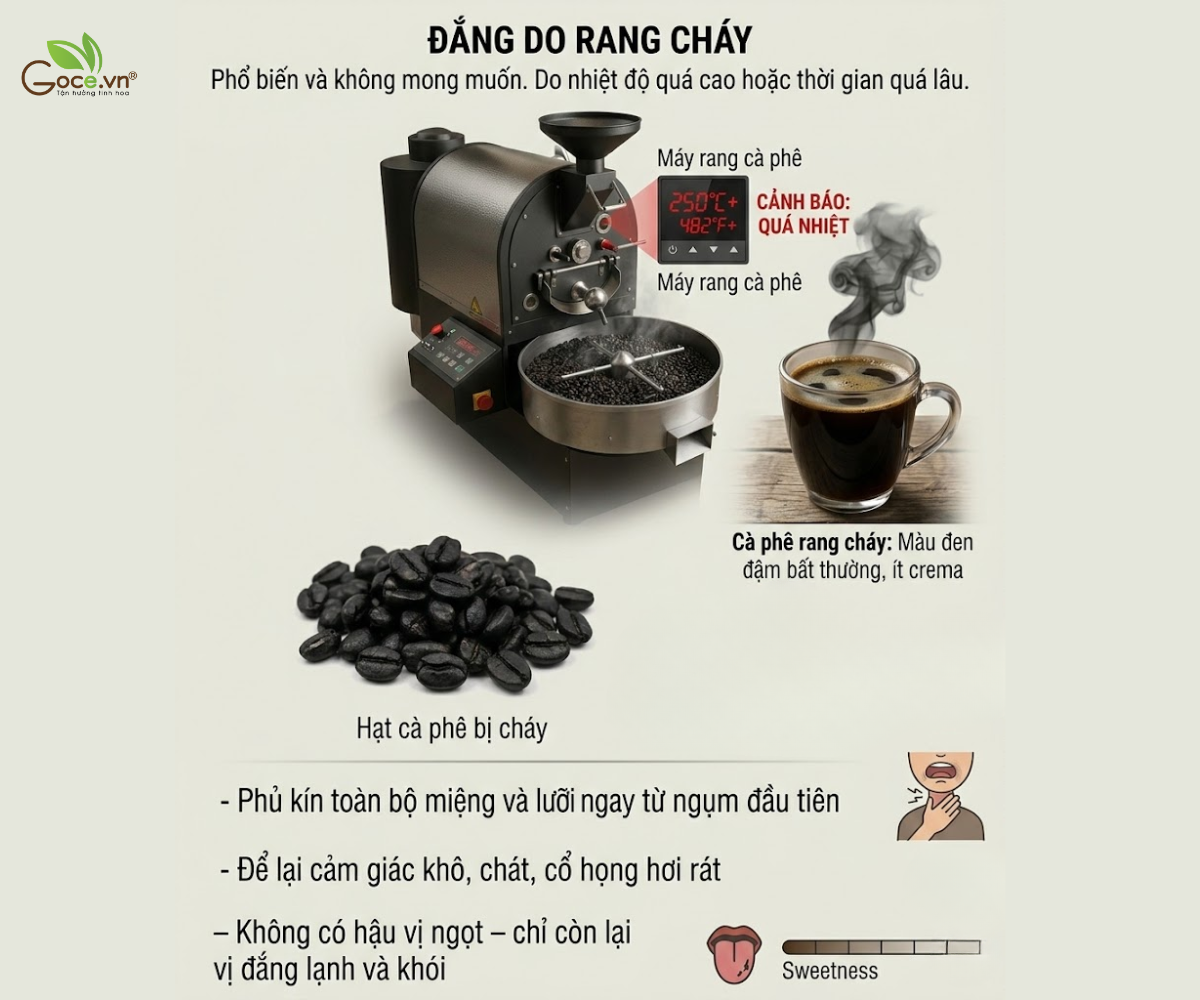 Đây là loại đắng phổ biến nhất và không ai muốn. Khi hạt cà phê bị rang quá lửa nhiệt độ quá cao hoặc thời gian quá lâu các hợp chất hữu ích bị phân hủy và sinh ra phenylindane: một phân tử đắng gắt, cay và rất dai.