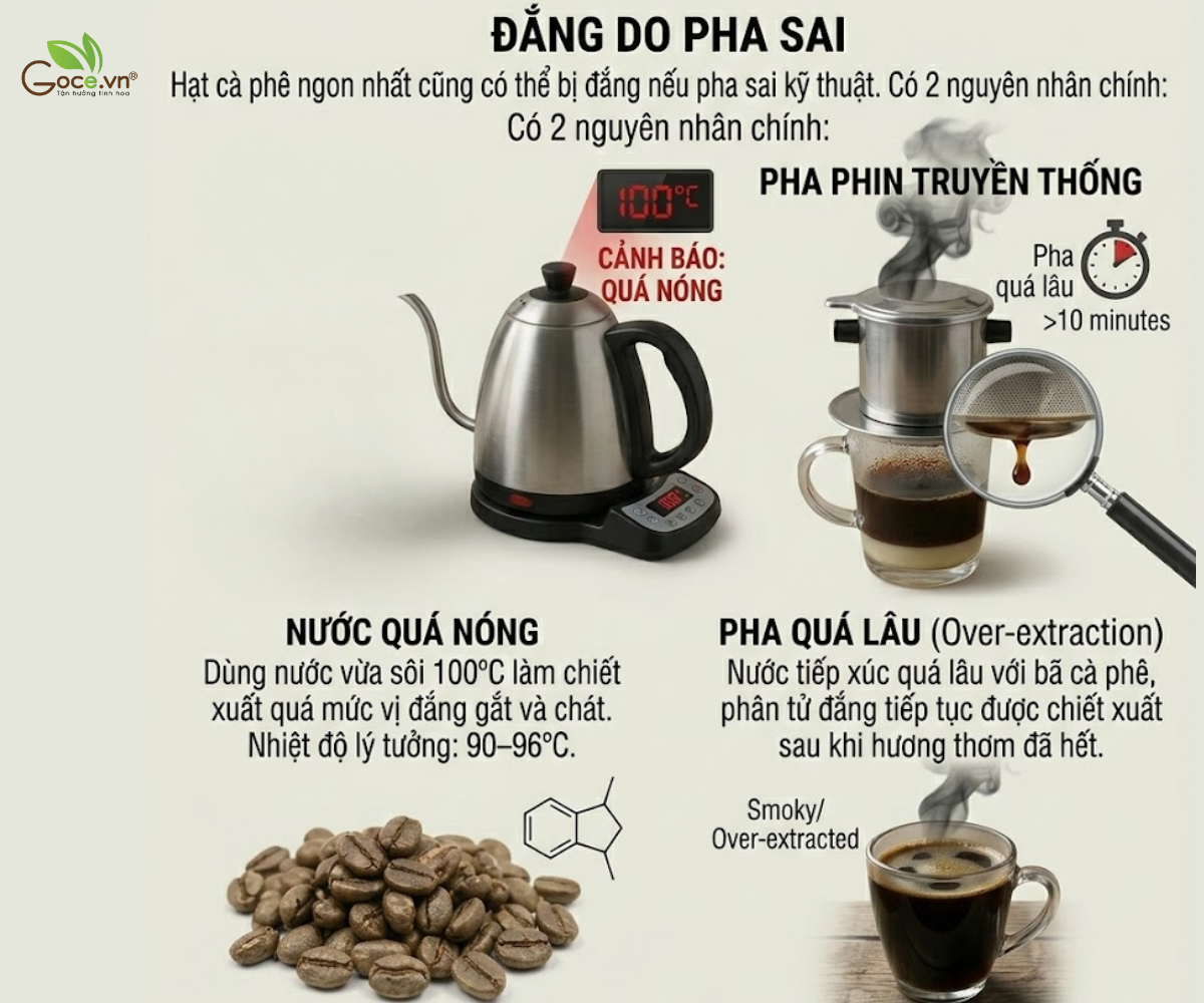 Nước quá nóng: Nhiệt độ lý tưởng để pha cà phê là 90–96°C. Nếu dùng nước vừa sôi 100°C, nhiệt độ cao sẽ chiết xuất quá mức các hợp chất đắng trong thời gian ngắn, bỏ qua các hợp chất ngọt và thơm vốn cần thời gian ổn định hơn để hòa tan.