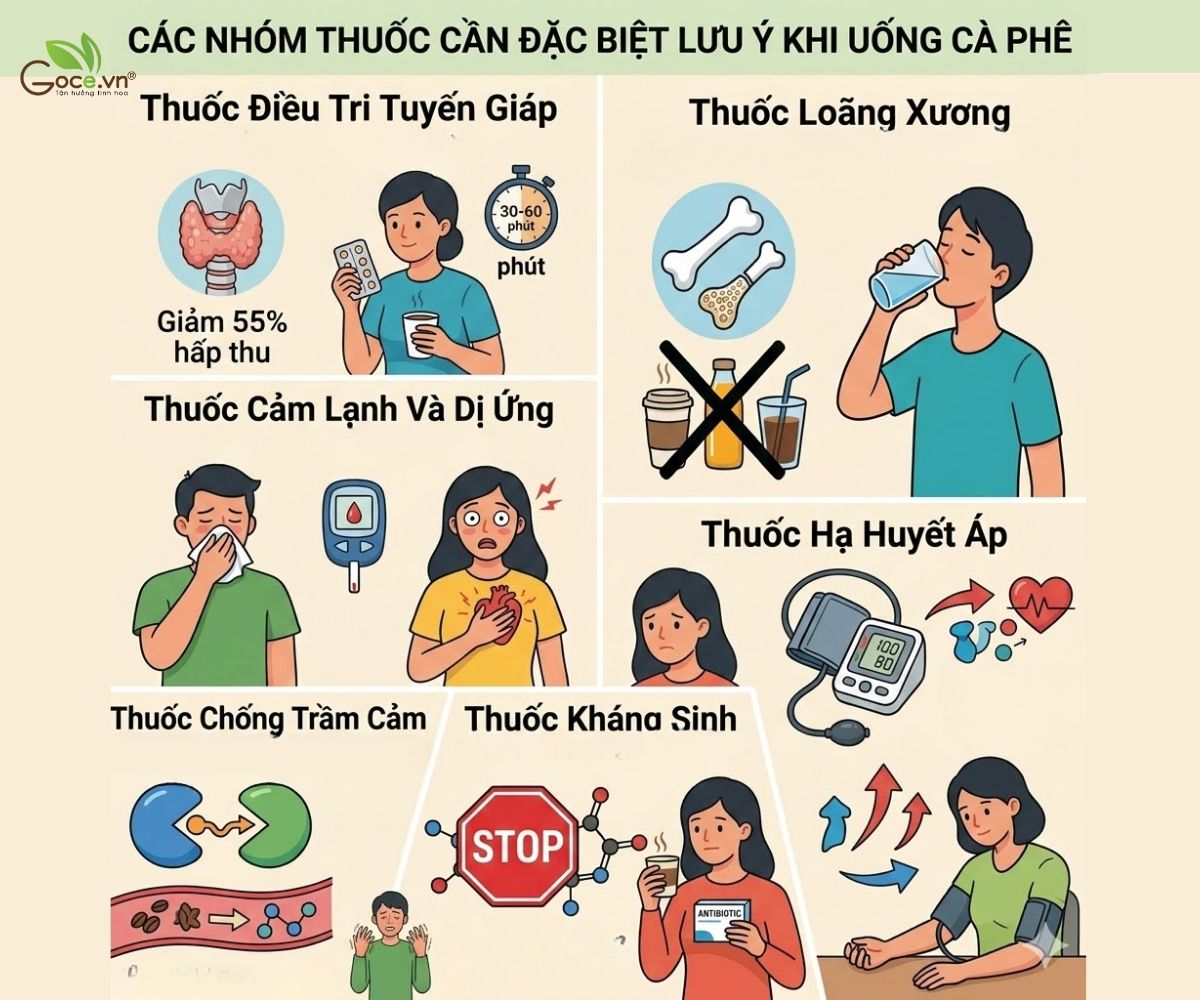 Levothyroxine - thuốc điều trị suy giáp - là một trong những thuốc nhạy cảm nhất với cà phê. Cà phê có thể làm giảm tới 55% khả năng hấp thu thuốc qua đường tiêu hóa. Bệnh nhân cần chờ ít nhất 30-60 phút sau khi uống thuốc mới được uống cà phê để đảm bảo thuốc được hấp thu đầy đủ.